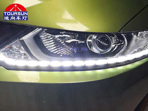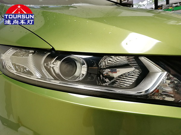 該車的顏色是特別的翡翠綠,加上動感的造型,顯得朝氣十足,而車燈的表現力就沒有那么優秀了。經觀察,該車的原裝車燈是傳統鹵素燈,車燈光照暖黃昏暗,這樣的車燈配上原車的外形可一點都不酷炫。