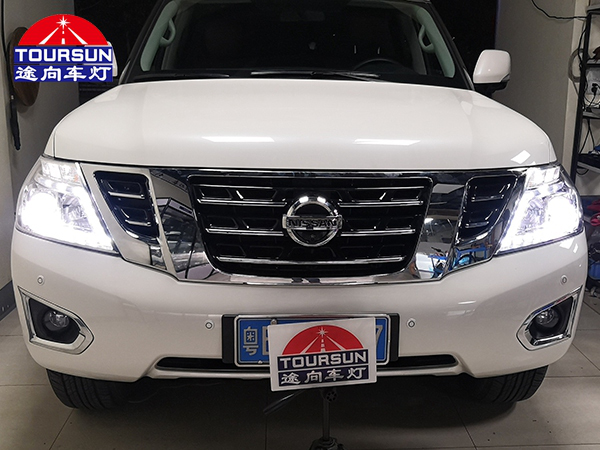 日產途樂的外形相對其他的車型來說,遵循的就是豪華轎車的外形加上suv車型的大容量,白色簡約的顏色搭配寬大的車身,看起來即沉穩又有魅力。此次來到途向店進行車燈改裝的是一輛低配版的日產途樂,低配版的日產途樂有一個區別,就是它的車燈沒有日行燈的功能,車主由于之前在我們店已經升級了海拉5的雙光透鏡,效果很滿意,這次打算加上日行燈。