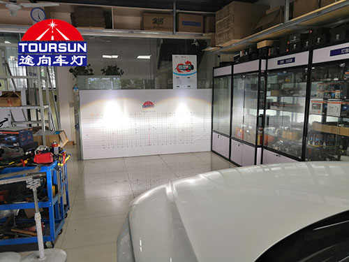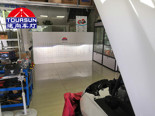 車燈升級前的近遠光情況:打開近光,射出的分界線清晰,光照程度良好,近光打在檢測板上,射程良好,光束亮;遠光打在檢測板上的光束較為分散,呈現左邊光團比右邊光團較量的現象,光束分布不均。