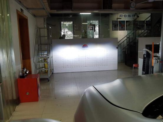 車燈升級(jí)前的近遠(yuǎn)光情況:從檢測(cè)板上的近光射出的光切線模糊,燈光暗淡;遠(yuǎn)光燈射程過近,只剩一邊有光團(tuán),另外一只已經(jīng)壞了。這樣的燈光效果,連基本的行車安全都保障不了,升級(jí)車燈是必然的。