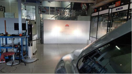 車燈升級前的近遠光情況:從檢測板上的近光射出的光可以明顯看出問題所在,燈光暗淡柔和,切線模糊,燈光分布不均勻;遠光燈射程過近,右邊遠光燈已壞,遠光效果可想而知了。這樣的燈光效果,怎么能滿足得了夜晚的行車需求?
